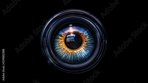 Close-Up View of Vivid Eye Resembling Camera Lens, Striking Blue, Orange, and Yellow Iris With Reflective Pupil and Concentric Mechanical Rings for a Futuristic Concept