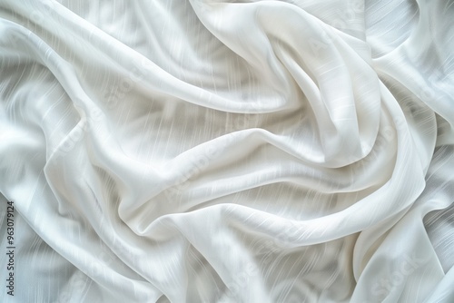 Close-up view of white fabric possibly curtain or sheet with intricate texture and patterns. Fabric folded in half revealing details. Blurred background focuses on fabric texture.