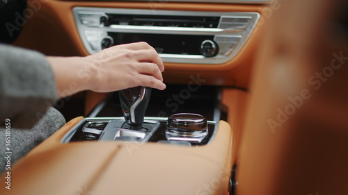 Closeup woman hand keeping automatic gear in car. Female hand changing gear
