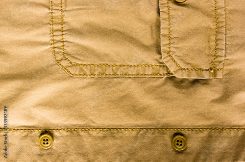 clothing items stonewashed cotton fabric texture with seams, clasps, buttons and rivets, macro