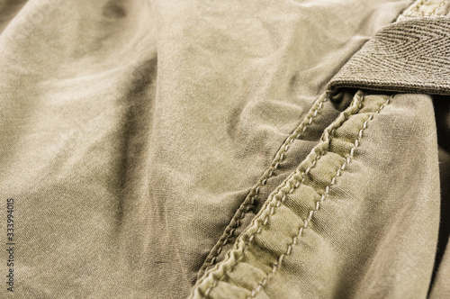 clothing items stonewashed cotton fabric texture with seams, clasps, buttons and rivets, macro