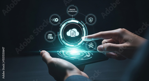 Cloud computing and data management with hand interacting with a modern tablet and data icons.