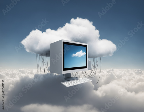 Cloud computing concept with a computer emerging from clouds