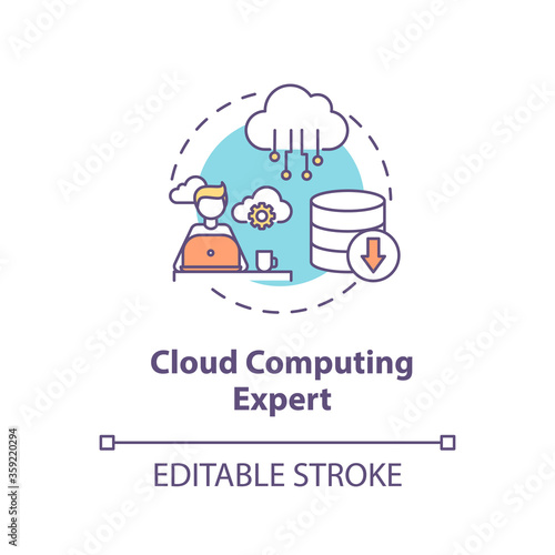 Cloud computing expert concept icon. Database management. IT professional. Information processing specialist idea thin line illustration. Vector isolated outline RGB color drawing. Editable stroke