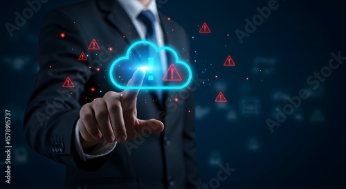 Cloud Computing Security Breach Concept - Businessman Pointing at Digital Cloud with Warning Icons