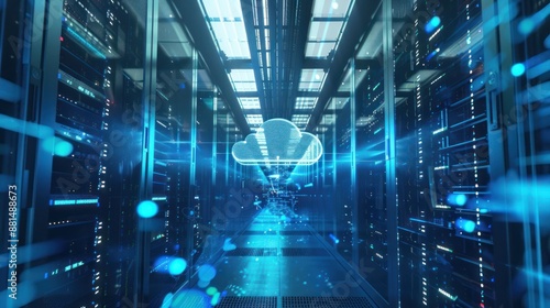 Cloud Computing Server Room with Digital Cloud Icon