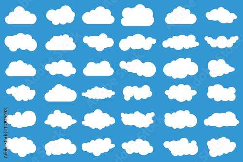 Cloud icons on blue background. 36 different vector clouds. Cloudscape. Isolated clouds.