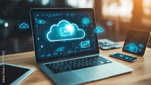 Cloud storage hologram with interconnected laptop, tablet, and phone, symbolizing digital sync