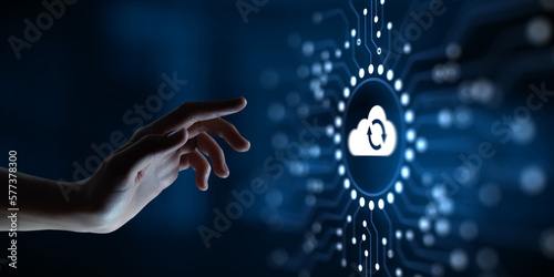 Cloud technology concept. Computing data storage. Software infrastructure. Hand pressing button.