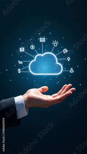 Cloud technology illustration on open hand. Represents data access, networking, and online communication with a dark background