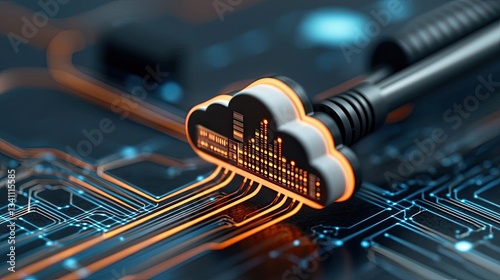Cloud technology in data transfer and computing storage concept. Close-up of a cloud symbol connected to a circuit board, symbolizing digital data transfer.