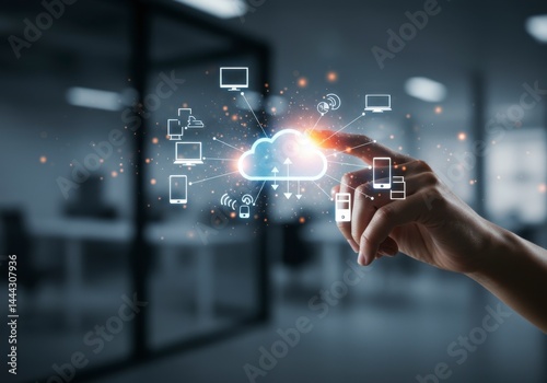 Cloud technology interaction corporate office digital communication modern environment close-up view future connectivity