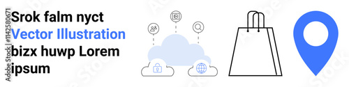 Cloud with connected icons, shopping bag, and blue location pin representing digital e-commerce. Ideal for online shopping platforms, cloud storage services, business solutions, delivery services