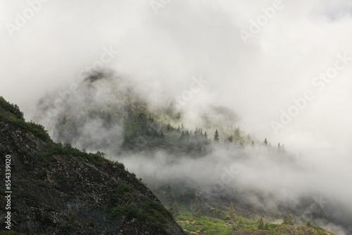 Clouds cover tall trees and a lush landscape on the side of a mountain.; Inside Passage, Alaska