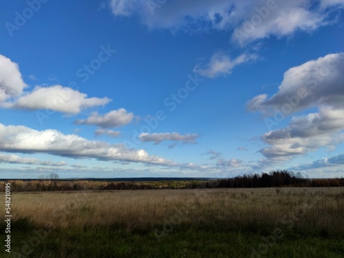 Clouds hang over the field in even rows. On an autumn sunny day, cumulus clouds hang over a distant forest and a meadow with yellowed grass. The White Clouds lined up in long, even rows.