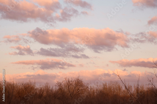 Clouds in the rays of sunset over the tops of the spring bare forest
