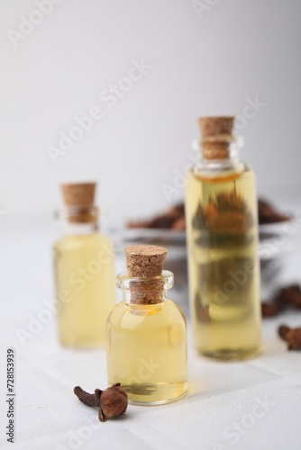 Clove oil in bottles and dried buds on white tiled table, closeup