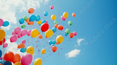 Cluster of colorful balloons floating against a bright blue sky