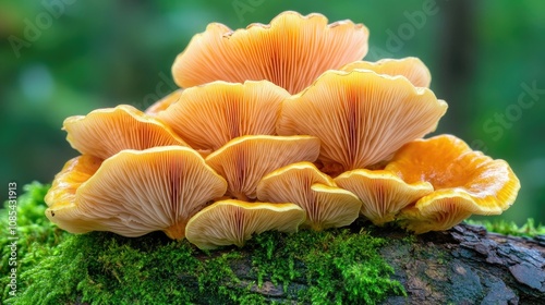 Cluster of mushrooms with delicate caps growing on a mossy log, their shapes and textures highlighted in soft natural light