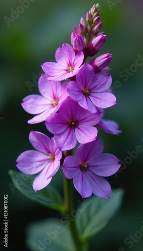 Cluster of rich purple flowers, delicate pink hue, pastel, nature photography, blossom