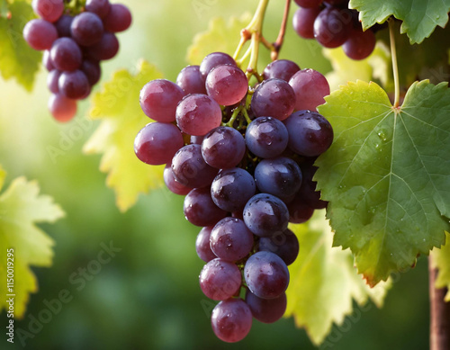 Cluster of ripe, juicy grapes, glistening with dewdrops
