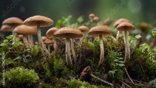 Cluster of Small Brown Mushrooms on Mossy Surface in Woodland Environment Close Up