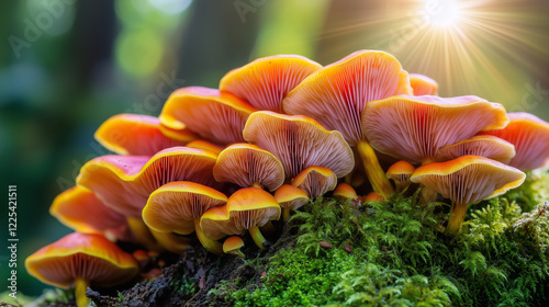 Cluster of vibrant mushrooms growing on a moss-covered forest floor, with sunlight streaming through the trees in the background.
