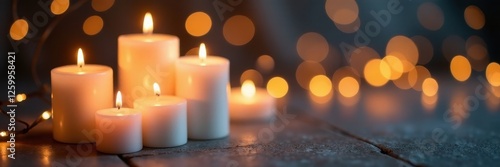Cluster of white pillar candles and string lights, bokeh effect , night, warm light