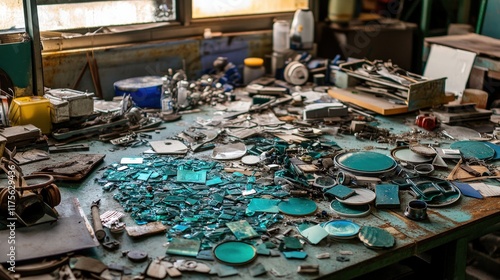 Cluttered Workshop Table Covered in Glass Shards, Tools, and Metal Objects, Offering a Detailed View of a Creative and Chaotic Art Environment