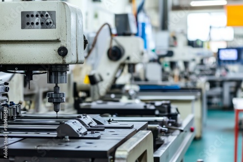 CNC Machine With Multiple Spindles Operates Simultaneously On Different Parts. The Workshop Is Busy With Various Machines In Action