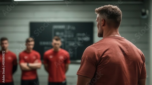 Coach holding a strategy session in the locker room, explaining game tactics on a board, soccer, coaching, leadership