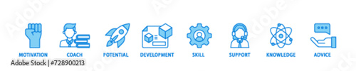 Coaching banner web icon illustration concept with icon of motivation, coach, potential, development, skill, support, knowledge, and advice icon live stroke and easy to edit