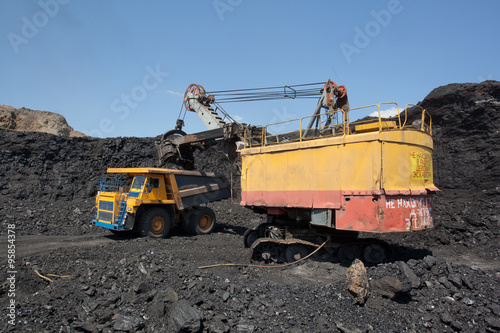 Coal mining. The dredge loads the truck coal.