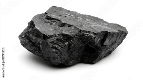 Coal piece isolated, black anthracite rock lump, charcoal stone, carbon block chunk, smoldering coal, black fire mineral on white background