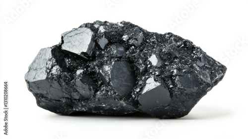 Coal piece isolated, black anthracite rock lump, charcoal stone, carbon block chunk, smoldering coal, black fire mineral on white background
