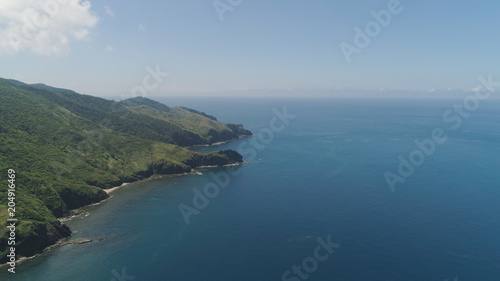Coast of a tropical island Palau with mountains covered with rainforest and trees. Santa Ana, Philippines. Aerial view of island with wild beaches.