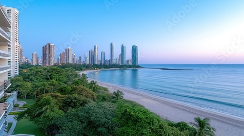 Coastal cityscape at dawn. Lush greenery meets turquoise water, bordered by high-rise buildings. Tranquil morning scene