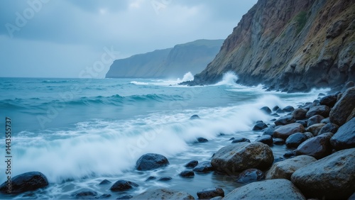 coastal cliff ocean photogenic. Serene coastal view with rocky shoreline, waves crashing gently against the stones under a cloudy sky.