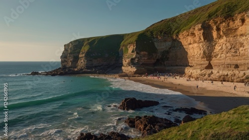 Coastal Cliffs and Sandy Beach at Sunset Golden Hour