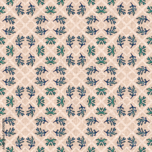 Coastal coral reef geometric quilt style linen pattern. Seamless marine fabric effect background for nautical home decor. Natural kelp geo damask in hand drawn watercolor tile print.