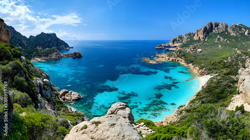 Coastal Panoramic View: Turquoise Bay, Rocky Cliffs, and Lush Mediterranean Vegetation