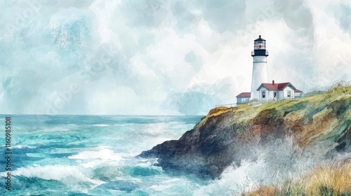 Coastal scene featuring lighthouse atop rocky cliff with turbule