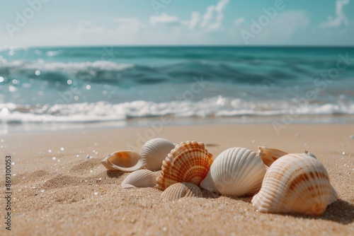 Coastal scene with seashells scattered on a sandy beach, perfect for travel or nature-themed designs