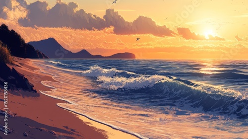 Coastal Sunset Painting: Birds Fly Over Ocean Waves and Sandy Beach