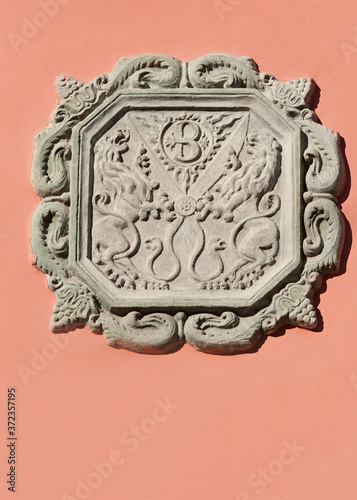 Coat of arms with snakes and lions on an old building on Market Square in Lviv Ukraine