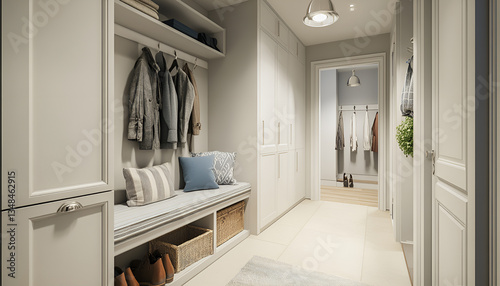 Coat rack, cabinet and shoe storage bench in hallway. Interior design