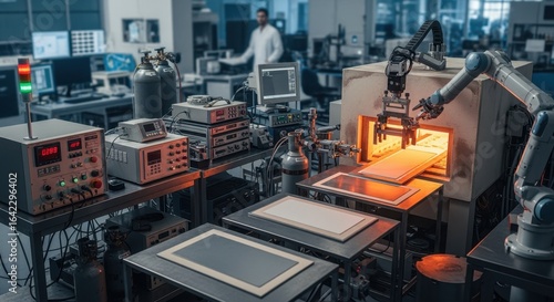 Coating furnace in an industrial lab where metal interconnect plates undergo ceramic layer application for solidoxide fuel cells.