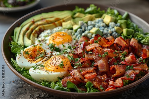 Cobb Salad - Cobb salad with rows of bacon, egg, avocado, and blue cheese.