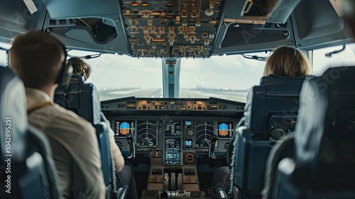 Cockpit view with pilots preparing for takeoff. Aviation, technology, and teamwork in a professional cockpit environment