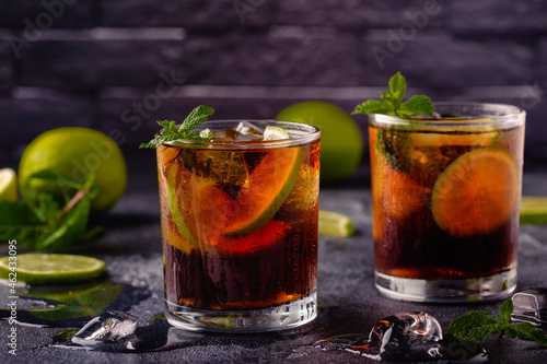 cocktail Cuba Libre with lime and ice